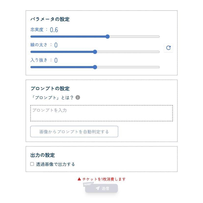 This feature generates refined lineart from rough sketches. Compared to the inking function, it supports even rougher input and can be used not only as a final illustration but also as a reference during production — for example, to refine a rough drawing to explore direction, or to see how AI interprets your sketch style. You’ll need to enter an English prompt describing the image you want to generate along with your sketch. If entering a prompt is difficult, you can use the auto-prompt feature to generate one from your image. However, this may not always reflect your intent accurately, so please edit the prompt as needed. This helps the AI understand your sketch and propose the best possible lineart.